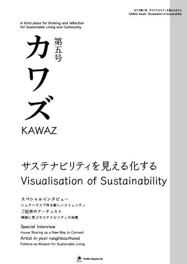 サステナビリティって、一体なんだろう? 漠然としたイメージはあっても、 具体的には、なんだかよく分からない。 そんな疑問を追求すべく、 サステナビリティに繋がることを、 具体化するために活動している方たちを特集しました。 節電生活、建築、フェアトレードなど、 身近で気になるトピックにフォーカスしています。 What does "Sustainability" really mean? Although we have some vague images, most of us are not sure exactly what it means. To tackle such a question, we covered the people who are working on to materialize their engagement in sustainability. We focused on different topics of our concern, including energy savingm architecture, fair-trade and more. 目次 〇特集:サステナビリティを見える化する ●豊かさの新たな視点-電気代0円生活 ソーラー女子 フジイチカコさん ●エコマテリアルを掘り下げる 及川敦子建築設計室 及川敦子さん ●フェアトレードを見える化する わかちあいプロジェクト松木傑さん ●消費者と企業をつなぐ企業のエシカル通信簿 消費から持続可能な社会をつくる市民ネットワーク ● 見える化してつなげる、オーガニック給食マップ オーガニック給食マップ 杉山敦子さん、野々山理恵子さん ●将来世代のためのドミノ的連鎖を仕掛けるために 匝瑳市地域おこし協力隊 土屋彰さん 〇スペシャルインタビュー ●シェアハウスで作る新しいコミュニティ マナシェアハウス 大島美樹さん 〇ご近所のアーティスト ●神話に学ぶサステナビリティの知恵 神民芸 橋本祥子さん 〇小出弁護士のグリーンライツコラム(二) ●日本の若者たちによる気候訴訟を見える化する by 小出薫 〇ゆる放談 ●「公立」図書館から「公共」図書館への転換 図書館司書 井東純一 & 絵本翻訳家 橋爪千代子 〇世界のコミュニティ ●ビーバーは野生の救世主? by トム・ハリスン 〇オルタナティブストーリーを生み出すために(連載5) ●希少性は人為的なもの? by ペガ(カワズ編集長) ●思考のサードプレイス的・編集会議録 ・~・~・~・~・~・~・~・~・~・~・~・~・~・~・~・~・~・ Contents 〇 Cover Stories -- Visualisation of Sustainability ●Rethinking Modern Comfort Off the Grid: Zero Electricity Bills Solar Girl, Chikako Fujii ●Delving into Eco-Friendly Building Materials Atsuko Oikawa, Oikawa Atsuko Architectural Design Office ●The Transparency of Fairtrade Pastor Suguru Matsuki, Wakachiai Project ●Corporate Ethics Ratings The Citizens’ Network to Build a Sustainable Society through Responsible Consumption (SSRC) ● Visualising Solidarity: The Organic School Lunch Map Atsuko Sugiyama & Rieko Nonoyama,Organic School Lunch Map ● Waging Domino Effects for the Future Generations Akira Tsuchiya,Sosa-city Revitalisation Cooperation Team 〇 Special Interviews ●House Sharing as a New Way to Connect Miki Oshima, Mana Share House 〇 Artist in your neighbourhood ●Folklore as Wisdom for Sustainable Living Shoko Hashimoto – Kamingei Storyteller 〇 Green Rights Columns by Koide, Esq. (2) ●Visualising Japan’s Youth Climate Case by Kaoru Koide, Esq., Green Rights Law 〇 Absolutely No Limits ● To Transform Municipal Libraries into Public Libraries Junichi Ito, Librarian, & Chiyoko Hashizume, picture book translator 〇 Communities Across the World ●Wild Waters: Beavers, Rewilding and the Future of British Rivers by Thom Harrison 〇 To Create Alternative Stories (No. 5) ●Is Scarcity Real or Created? by Pega, KAWAZ Editor in chief ● Editorial Meeting - as a 3rd place -